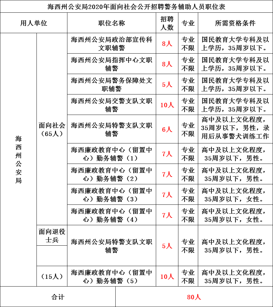 (一)招聘岗位本次公开招聘警务辅助人员80名。具体招聘岗位和人数详见附表《海西州公安局2020年面向社会公开招聘警务辅助人员职位表》。